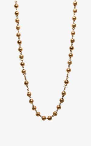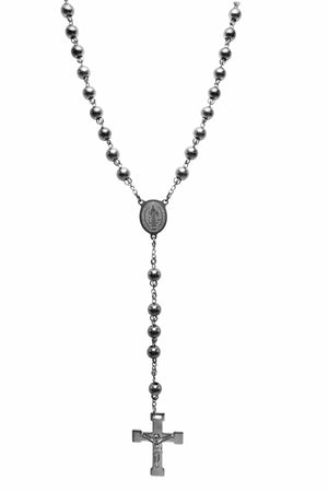 Make a statement in a long layering rosary which features a medium sized beaded necklace, a Virgin Mary pendant, and a cross pendant that dangles from the classic rosary shape.