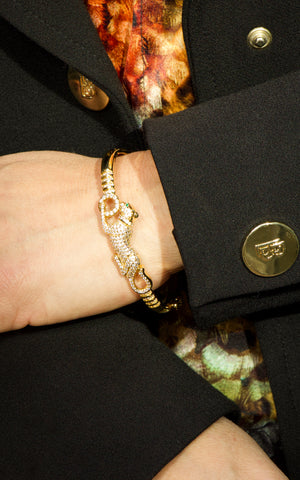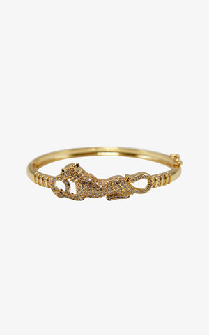 A bangle fit for the Egyptian gods, this bracelet features a sphinx cat decal gold pavé decorative crystals and gold hinge cuff closure.