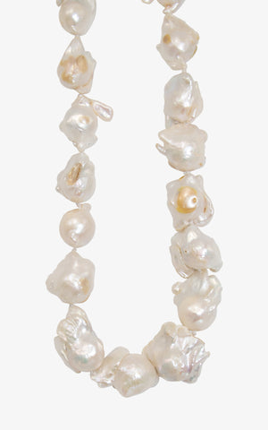 Hear the siren's call of the beauty of the sea in this baroque pearl necklace that features a strand of white pearls and a large silver clasp.