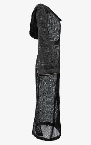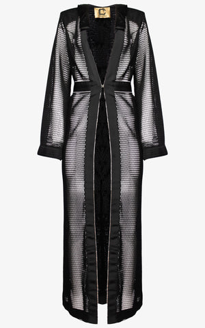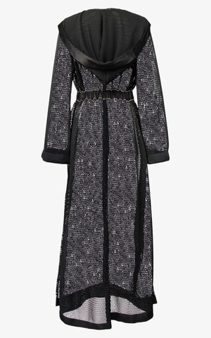Modern styling meets a classic silhouette in a cape that's as sexy as it is versatile and features a honeycomb mesh, black silk hood and matching lining, black ribbon stripe along the edges with rhinestone detailing, oversized draped sleeves, and a front hook closure along the matching waistband of black ribbon and rhinestones.