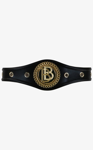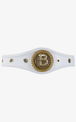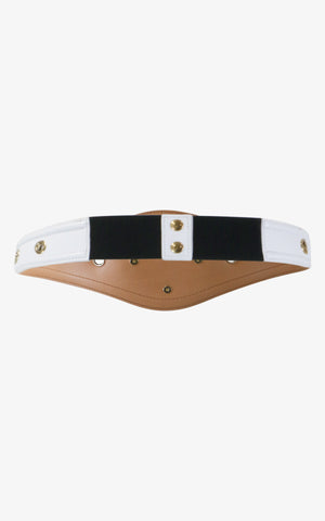 Bold and mesmerizing, this belt takes inspiration from ancient armor and showcases a large medallion in the front, leather that molds around medallion and rivet detailing, rivets along the body, elastic along the back for a perfect fit, and a dual snap closure.