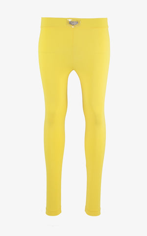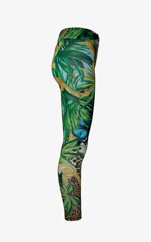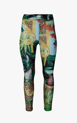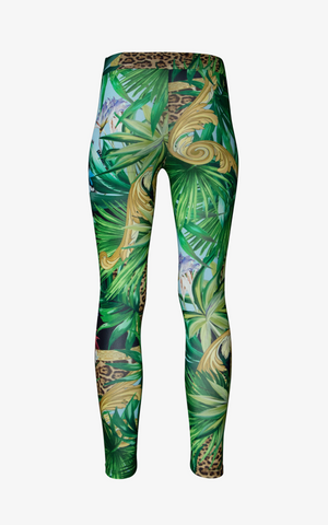The confluence of athleisure, high fashion, and the beauty that comes from a jungle paradise, these jungle pants feature a high waist, a long and fitted silhouette, a gold and acrylic triangle decal along the front, and an overall extravagant jungle and gold filigree patterned stretch fabric.