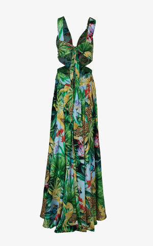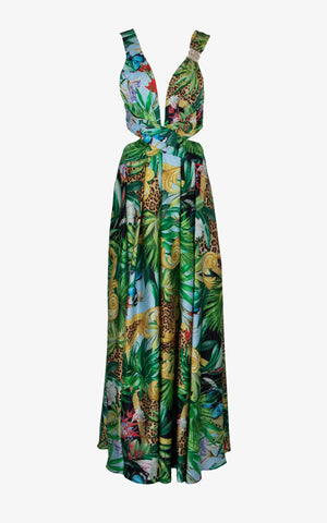 A dress that embodies accomplishment, the feeling of triumph after searching tirelessly, and the beauty and strength of our natural world, this dress features a floor-length a-line draped silhouette, pleated cinched waist detailing, criss-cross front bodice, 2" straps, back tie closure, open back and side cutouts, a gold medallion along the left strap, and an overall extravagant jungle and gold filigree patterned satin fabric.