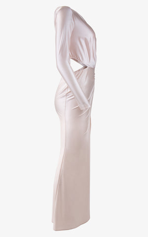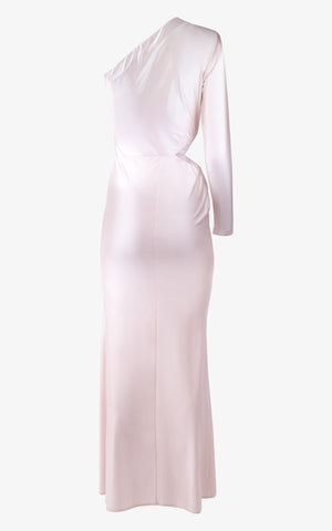 A dress as brilliant as the most colorful spring sunset, this candy-toned gown is both comfortable and dazzling and features a long sheath silhouette that hugs your curves, ruched detailing along the front of your hip, a long and daring slit up the leg, asymmetric sleeves with one long sleeve and one strapless, and a stunning cut-out along the back and waist.