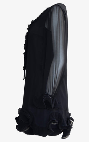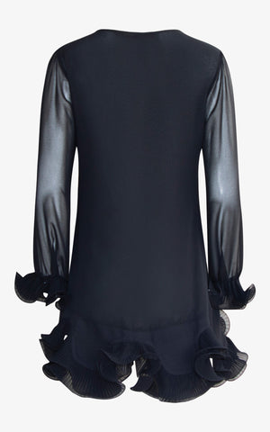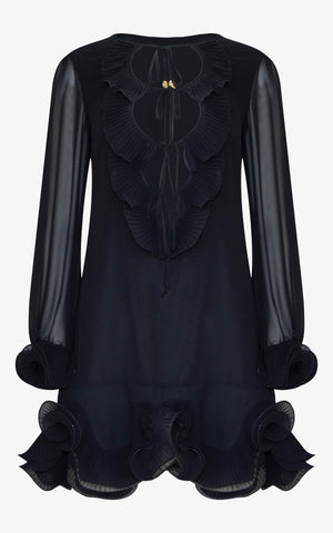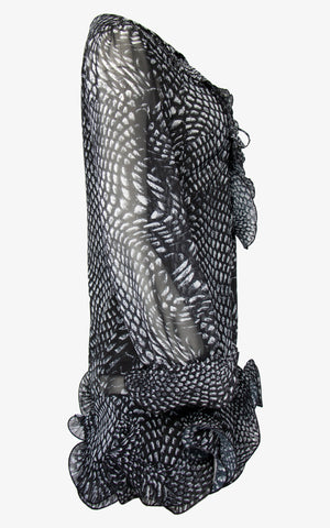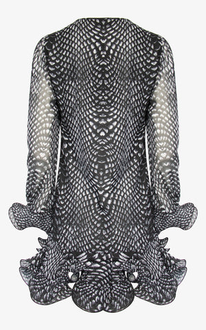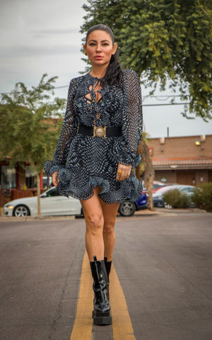 A dress intended to celebrate yourself and an inspiration to live life to the fullest, this mini dress features a sheer yet bold snake print fabric, long sleeves, a lace front plunging V neckline with ruffled accents, and ruffles along the sleeve cuffs and skirt edge.
