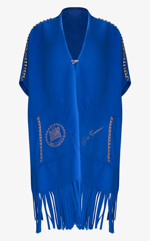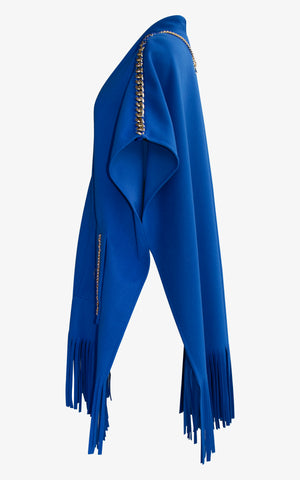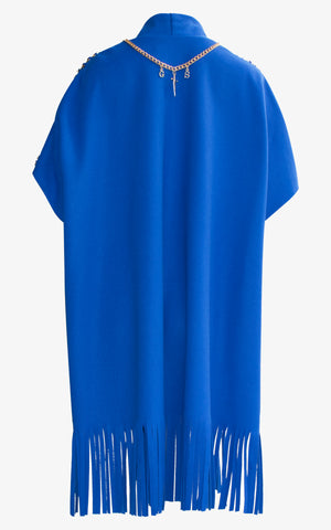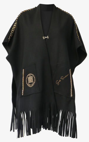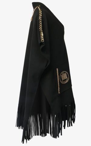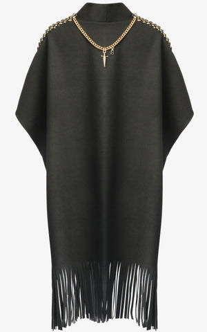 Relax, sit back, and sip the cocktail of your choosing in a poncho that's as comfortable as it is bold. With a draped and relaxed shape, fringe edging, gold clasp along the front, dual front pockets with geometric design, large gold chain detailing along the shoulders, and a draped gold chain with charms that sways along the back of the neck.