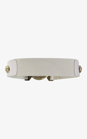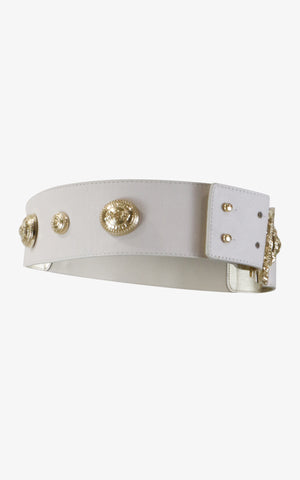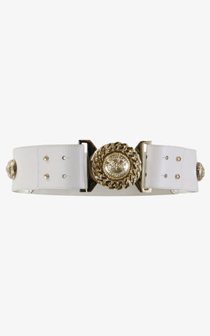 A testament to maximalist grandeur, this wide leather belt makes a bold statement with it's gorgeous details such as a large front medallion in gold, contrasting fold over leather with snaps, and intricately decorated gold baubles protruding across the belt.