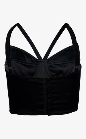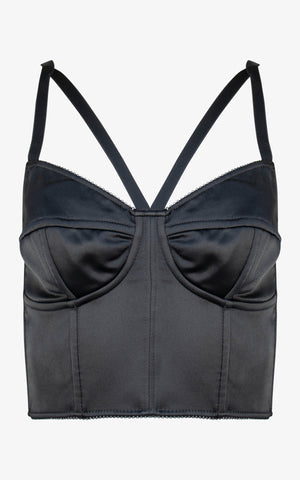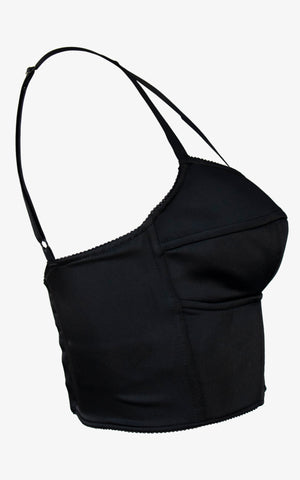 Sexy has never been as simple as in this corset style top which features a figure-hugging silhouette, structured ribbing throughout, molded cups, strap detailing, and hook-eye closures along the back.