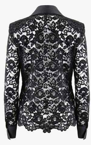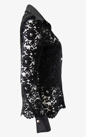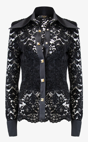 Urban detailing meets a classical silhouette in this velvet lace blouse that features long sleeves, a full length silhouette, an exaggerated flared collar in an opaque fabric, matching wrist cuffs, gold rock stud snap closures along the front and cuffs.