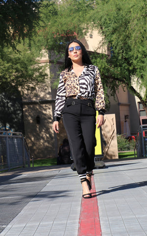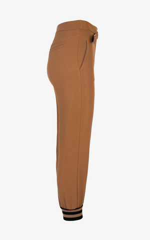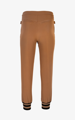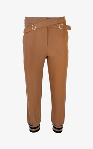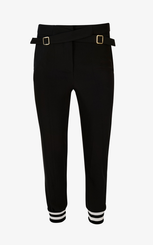 Relaxed and effortlessly stylish, these sweatpants feature a high waistline with crossed belt buckle detailing, a relaxed fit trouser, black striped cinched ankle cuffs, and side pockets.