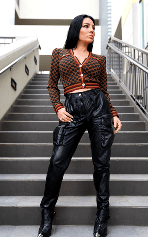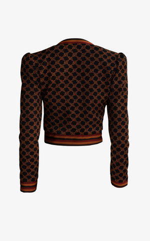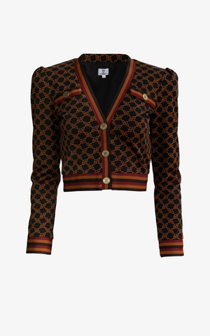 Draped and designed with a vision of elegant sporting events, mint juleps, and sparkling wine under the heat of the summer sun, this unparalleled Iconic jacket features a cropped cardigan silhouette, puff shoulder detailing, deep v neckline along the front, two faux pocket details with gold button closures, brown, gold and red detailing along sides, bottom, and cuffs, snap button closures along the front, and overall gold geometric line patterned fabric.