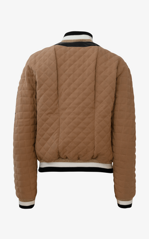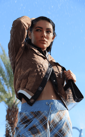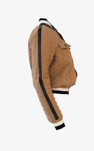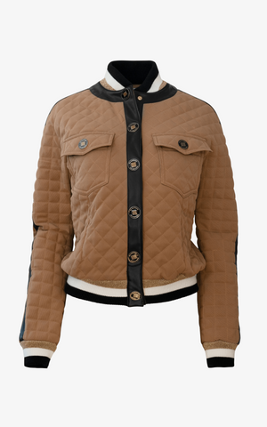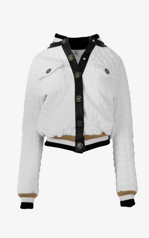 Encapsulating the feelings of crystal, laughter, champagne overflowing, and extravagant elegance, this jacket features luxurious quilted fabric, double-breasted pockets with black and gold oversized buttons, vegan leather detailing along the neckline, front closure, and arms, a cinched gold, white and black waist, and neckline, and snap button up front with matching gold and black buttons.