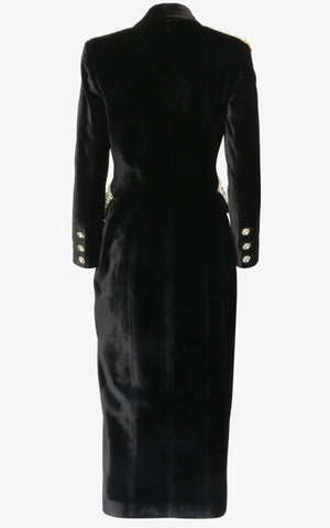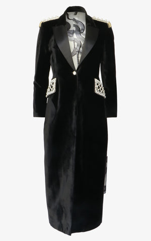 Imbued with the power of royalty and fit for a queen, the Revelation Royal Coat was inspired by the natural strength and beauty of women and is a testament to quality and design above all else. Made out of a plush velvet and lined in a snake-decorated silky satin, this coat features a long and tailored silhouette, an exaggerated tuxedo lapel that closes with a singular button, long sleeves, pearl embellished pockets along the hips, and stunning pearl and metal embellishments along the shoulders.