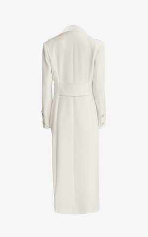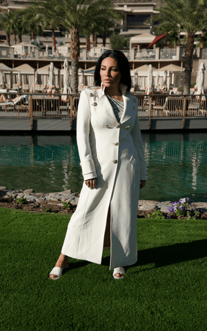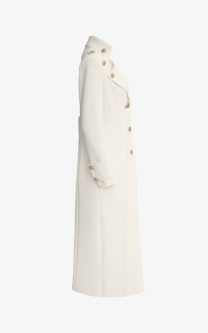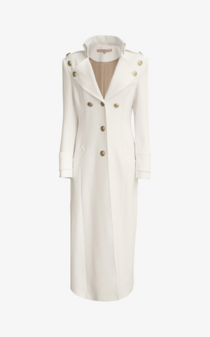 This bold, beautiful, and classic ankle-length coat features a relaxed with a slight fit silhouette, wide-open dramatic lapel, rigid collar, and an expanse of gold button detailing along with the front closure, lapel, shoulders, wrist cuffs, and breast.