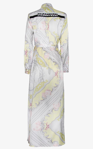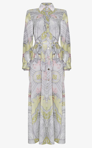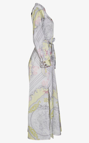 Step into the spotlight draped in poetic opulence. The Devoted to You Royal Cape is a floor-grazing masterpiece crafted from whisper-soft silk, adorned with an ethereal baroque motif in pastel shades of celadon, rose, and dove grey. Sculptural in silhouette yet fluid in motion, this piece cinches at the waist with a self-tie belt, blending the romance of regal robes with the tailored ease of a shirt dress. Delicate buttons run down the front, adding structure to its cloudlike drape, while symmetrical medallion detailing evokes heirloom grandeur.