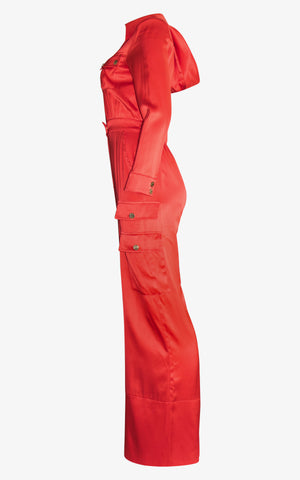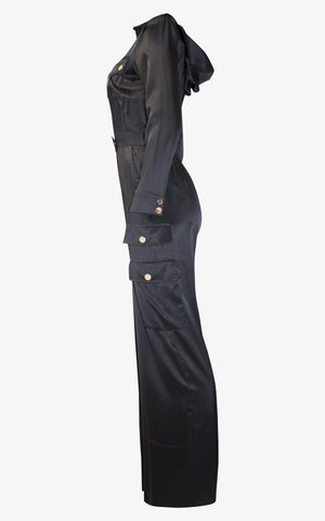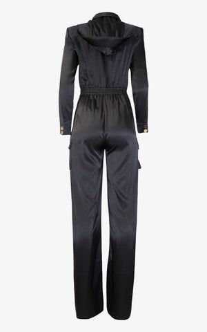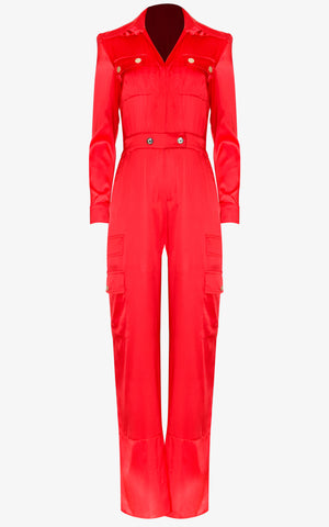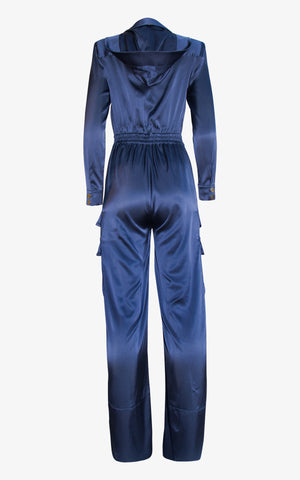 Surround yourself in the opulence of silky sensation with a jumpsuit that features a relaxed yet form fitting silhouette, long cargo pant legs, a fitted waist, long sleeves with cuff details, and pockets along the front breast and legs, and a snap closure collar.