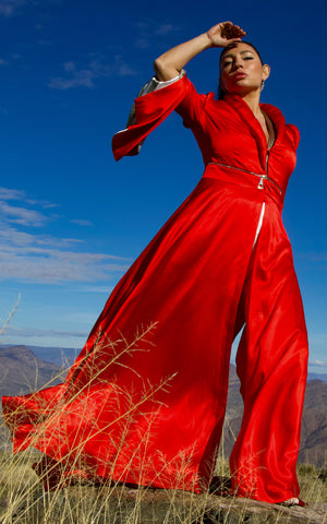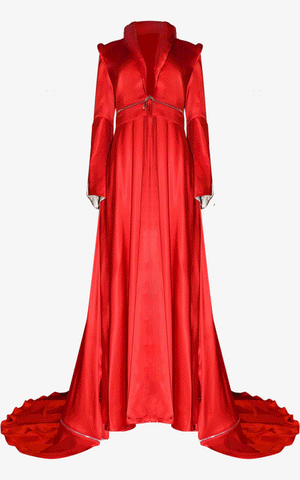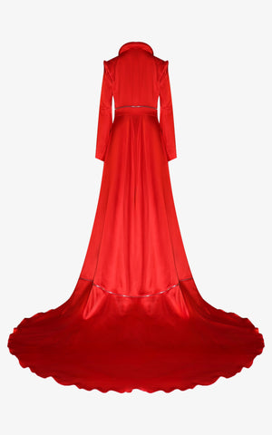 Luxuriate in sensation and embrace the tactile feeling of flawless quality in this 5-in-1 Superwoman Cape inspired by the power of womanhood. With features such as a full length silhouette, asymmetrical coiled snake-like detailing along the neckline and across either shoulder, long sleeves with a bell-cut and billowing drape, signature Carolina Couture inner lining, and detachable train and skirt which make this cape more than just the hero of a black tie gala, it's also the piece that can elevate any outfit to the sensational no matter the dress code.
