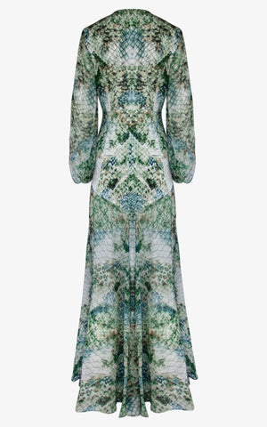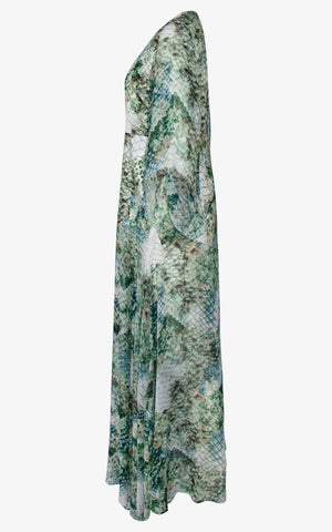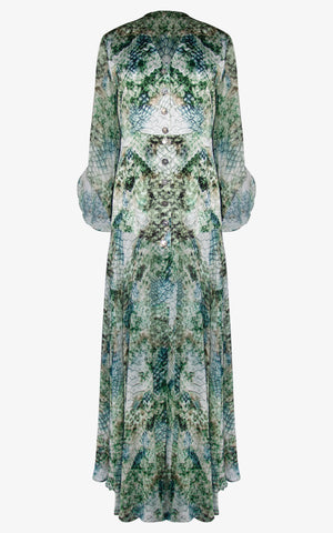 A mermaid style cape befitting the most royal amongst us, this cape embodies the elements of water and slides just as easily on. Featuring a fitted torso and hip with a dramatic leg flare, billowing sleeves with button adjustment, a plunging neckline, and a neutral gold and blue animal print throughout.