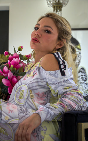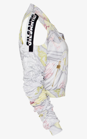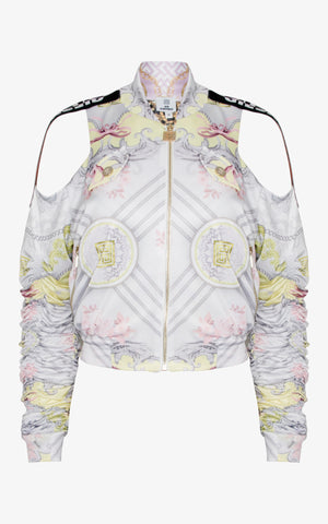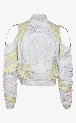 A daring remix of the classic bomber, this piece takes baroque beauty into bold new territory. Cut from silky fabric printed in delicate scrolls, floral flourishes, and soft pastel hues, its standout silhouette is defined by dramatic cold-shoulder cutouts and ruched sleeves that sculpt the arms with intentional texture.
