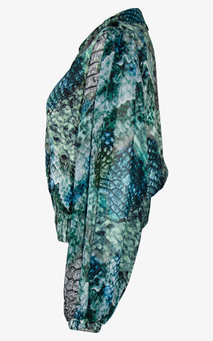 Combining the bold allure of Carolina Couture prints with the power and calming force of the ocean, this Poseidon bomber jacket features a relaxed fit, elastic waist, matching elastic wrist cuffs, a relaxed collar, a silver front zipper, and billowing sheer chiffon sleeves.