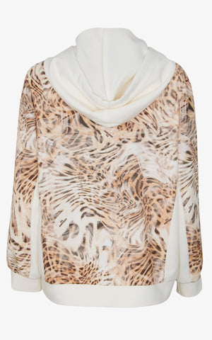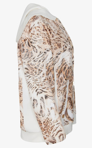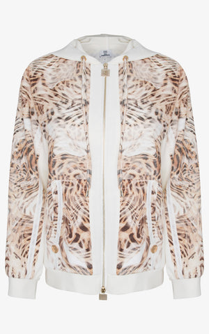 A bold blend of wild instinct and refined ease, this zip-up hoodie redefines off-duty luxury. Crafted from a silky-soft fabric, the statement-making print is a kaleidoscopic fusion of animal patterns rendered in warm neutral tones, giving a sense of movement and magnetism with every glance.