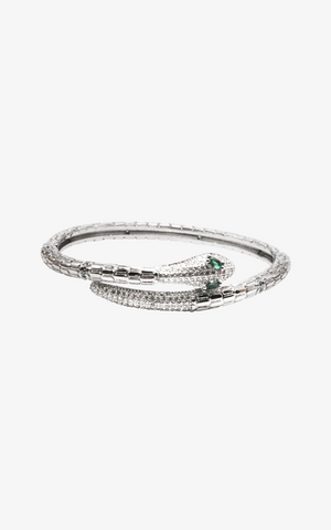 Some snakes are beautiful and some are vicious, at Carolina's Couture we embrace both personalities and interests and believe they work hand in hand. These one of a kind bracelet embodies the qualities of one of the vicious snake. This bracelet features a coiled snake shape designed to look like a snake is wrapped around the wrist, scale embellishments and detailing, jeweled scales, and green jeweled eyes.