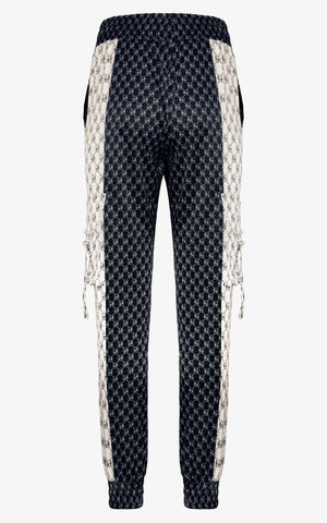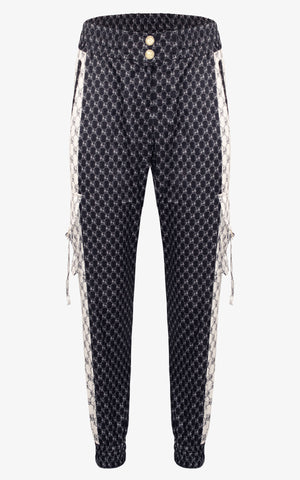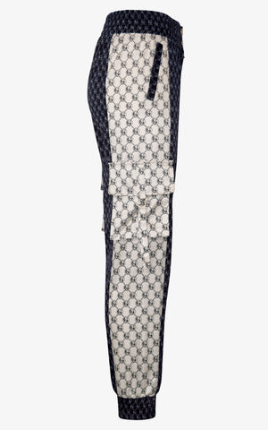 Pants that are as comfortable as they are sporty chic and feature an elastic waistline, elastic cuffed ankles, two gold button front closures, waist pockets, cargo pockets along the outer knee, and monogramed pattern throughout in contrasting navy blue and off-white.