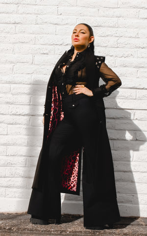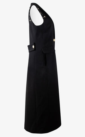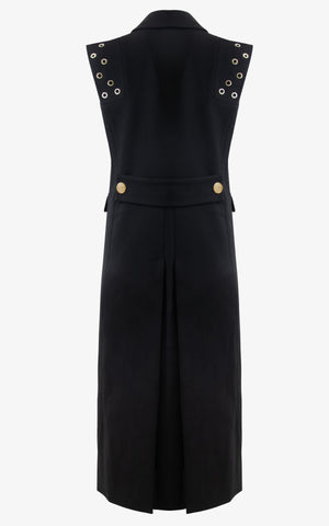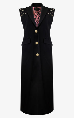 Make a statement in this gorgeous vest which features a figure shaping straight silhouette, a structured shoulder with gold rivet detailing, waist pockets, three gold button closures, and a plunging neckline.