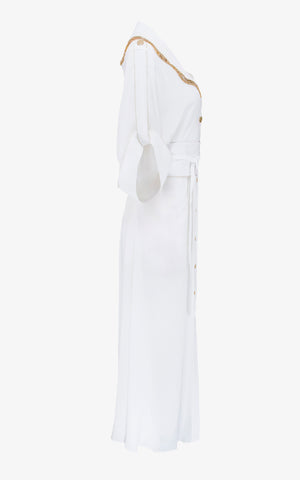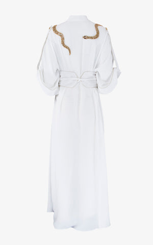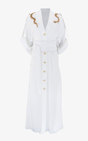 Featuring a subtle silky satin fabric that glides along the skin, a high structured collar, button-down front, 3/4 length sleeves with buttoned folds to hold the sleeves in a relaxed folded shape, and two beautiful jeweled snakes embroidered along the shoulders.