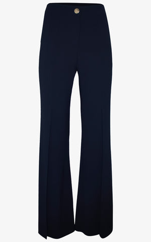 A masterclass in modern tailoring, these navy trousers embody quiet sophistication with unmistakable Italian precision. Cut from a fluid yet structured fabric, the high-rise silhouette elongates the leg, while pressed front seams and subtly flared hems create a clean, commanding line from waist to floor.