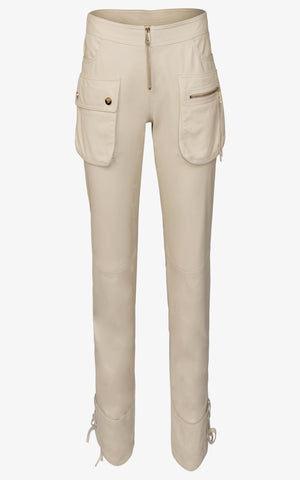 Leather pants are a bold and stylish wardrobe staple for every fierce fashion expert. These buttery soft leather pants feature a high waist, zipper front closure, lace up hem along the calfs, cargo style flap pockets along the thighs, and back pockets.