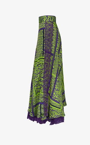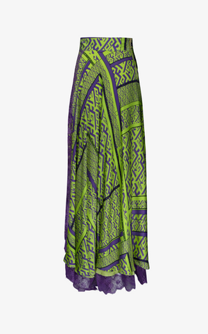 A skirt that highlights the power that comes from natural femininity and exhibits the strength that one feels when one overcomes a struggle. This delicate satin skirt has a high waist with zipper closure, a full-length silhouette, a high thigh slit, and delicate lace along the hem and slit.