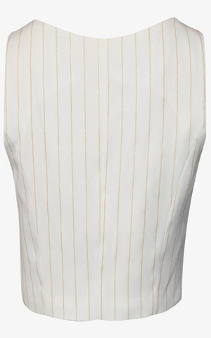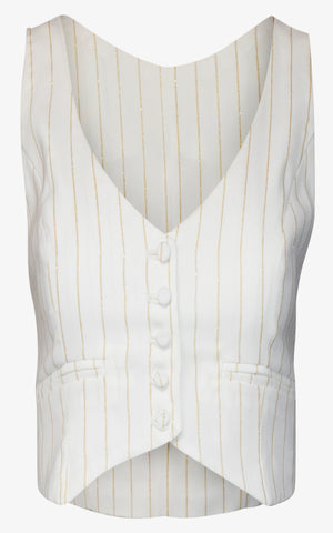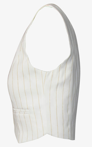 Heavenly pinstripe meets classic tailoring in a vest fit for the gods. Showcasing a plunging V neckline, cropped silhouette, waist pockets, and button closures along the front.
