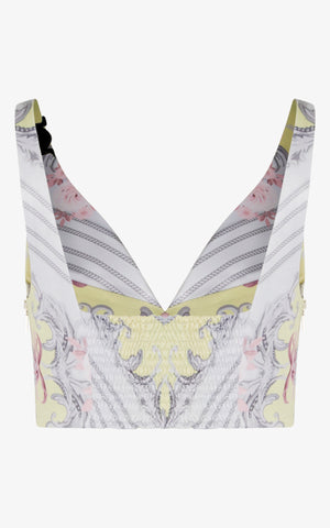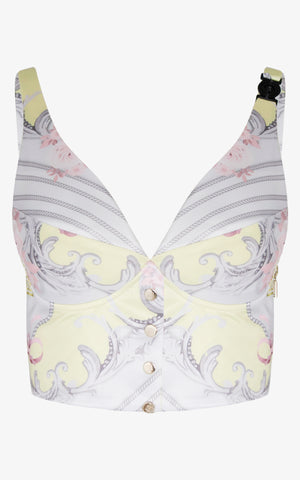 Refined romance meets sculptural structure in the Devoted to You Bralette Top. Designed in the same celestial silk print as its matching cape, this cropped silhouette channels regal elegance with a modern edge. The artful arrangement of baroque scrollwork, blush florals, and pastel lemon tones creates a harmonious tapestry, while the gold-tone buttons down the front echo vintage couture details.