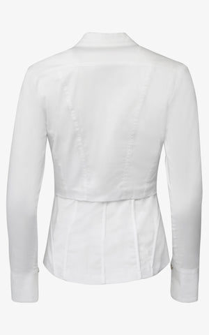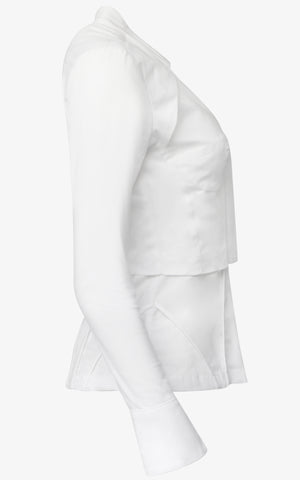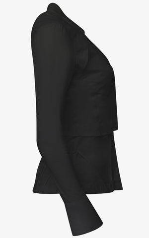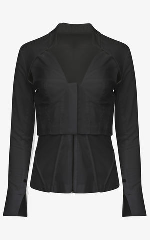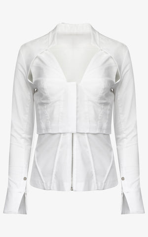 Street style structure meets the classic silhouette of a button-down in this corset-style top that features a plunging v-neckline, a cropped corset-like detail, long sleeves, structured paneling along torso to the waist, front zipper closure, open mandarin collar, and open wrist cuffs.