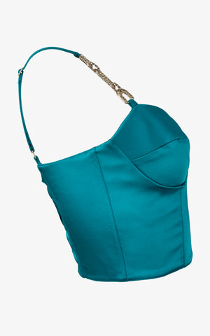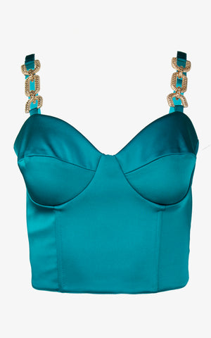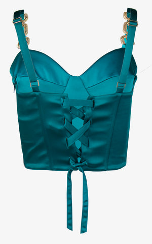 Become entranced with the jeweled beauty of the bewitching snake eye top which features a cropped corset style appearance, molded cups, lace up back, gold chain decals along the front straps, and a side zipper for ease of wear.