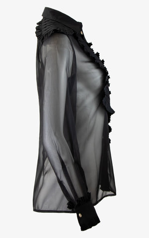When feminine allure meets masculine silhouette, this sexy yet refined blouse features a form fitting silhouette in a sheer fabric, a button-down front closure, opaque lapel bib with tiered pleat detailing, opaque shoulder detailing, opaque lining along wrist cuts and button closures, a structured lapel, and ruffle detailing along wrist and bib.