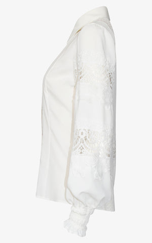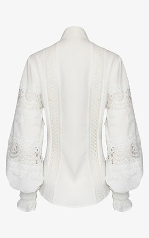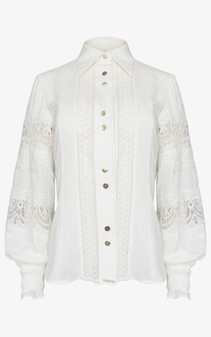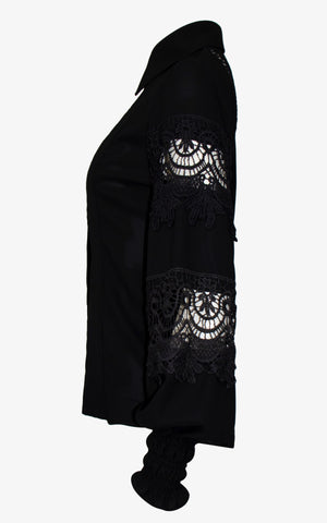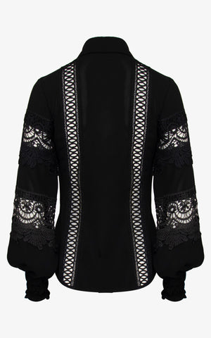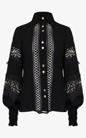 A shirt to elevate any outfit, this button front top features gold detailed buttons, lace along the front, lace along the sleeves, a structured collar, billowing sleeves with cinched wrist cuffs.