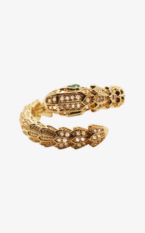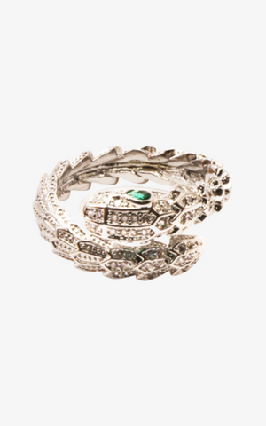Some snakes are beautiful and some are vicious, at Carolina's Couture we embrace both personalities and interests and believe they work hand in hand. These one of a kind rings embody the qualities of one of the vicious snake. Featuring a coiled ring shape, scale embellishment and detailing, jeweled scales, and green jeweled eyes.