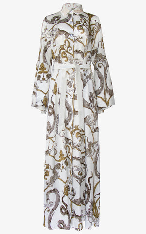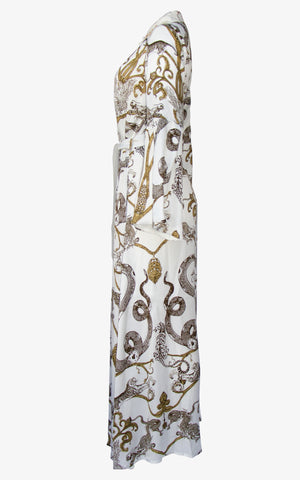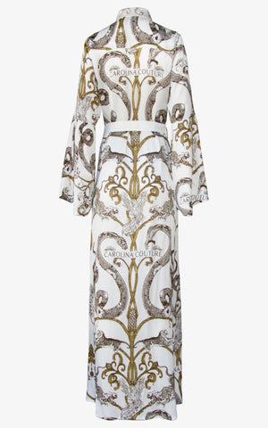 A royal cape decorated in the powerful mysticism and beauty of imagination's greatest predators, this cape featured a flowing silhouette, structured collar with crystal detailing, button-front closures in silver, white and gold animal print, flowing bell sleeves with slit for ease of use, and a matching white belt along the waist.