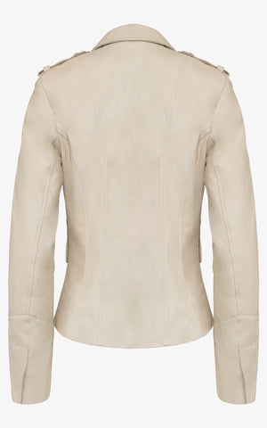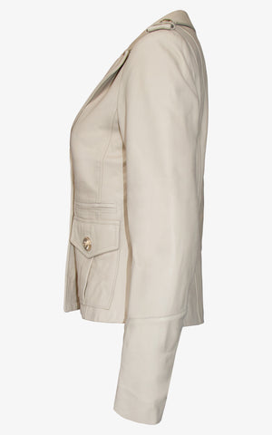Stylized after your most sophisticated blazer, this adventuring leather jacket features a tailored silhouette, a low V neckline, exaggerated lapels, dual button front closure, button closure flap pockets along wither waist, pocket details above each flap, long sleeves, and buttoned epaulettes along either shoulder.